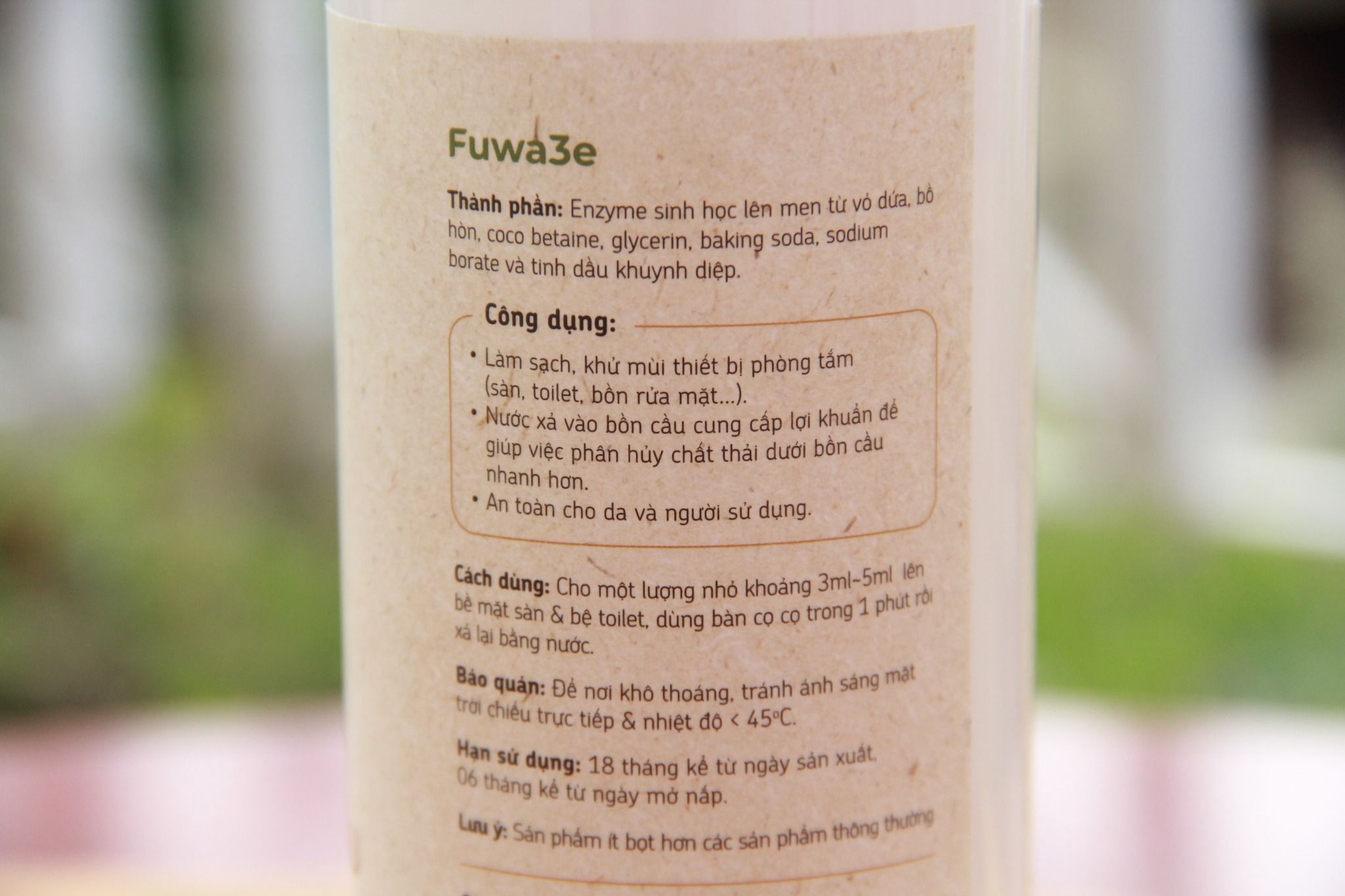 Thành phần: Enzyme sinh học lên men từ trái thơm, bồ hòn, Coco betaine, Glycerin, Baking soda, Sodium borate, tinh dầu khuynh diệp.